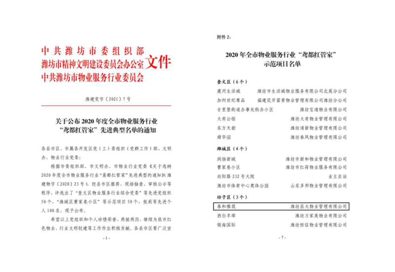2021年1月29日,濰坊昌大物業(yè)管理有限公司負(fù)責(zé)的泰和雅筑項(xiàng)目,在市委組織部、市文明辦、市物業(yè)行業(yè)黨委公布的2020年度全市物業(yè)服務(wù)行業(yè)“鳶都紅管家”先進(jìn)典型名單中,被評選為2020年度全市物業(yè)服務(wù)行業(yè)“鳶都紅管家”示范項(xiàng)目。