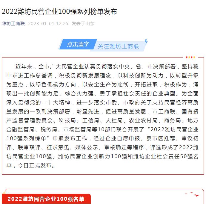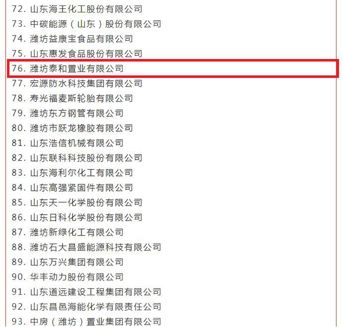 2023年1月1日,濰坊工商聯(lián)發(fā)布了2022濰坊民營(yíng)企業(yè)100強(qiáng)系列榜單,濰坊泰和置業(yè)有限公司同時(shí)斬獲“濰坊民企百?gòu)?qiáng)、社會(huì)責(zé)任50強(qiáng)”兩項(xiàng)榮譽(yù)。