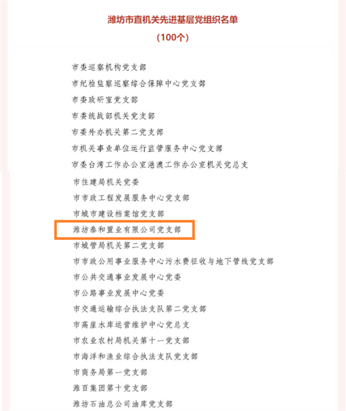 在慶祝中國共產(chǎn)黨成立103周年之際,為表彰先進(jìn)、弘揚(yáng)正氣,激勵(lì)市直機(jī)關(guān)各級(jí)黨組織和廣大共產(chǎn)黨員積極作為、奮勇爭(zhēng)先,6月24日,濰坊市委市直機(jī)關(guān)工委會(huì)決定,授予濰坊泰和置業(yè)黨支部等全市100個(gè)基層黨組織“濰坊市直機(jī)關(guān)先進(jìn)基層黨組織”榮譽(yù)稱號(hào)。