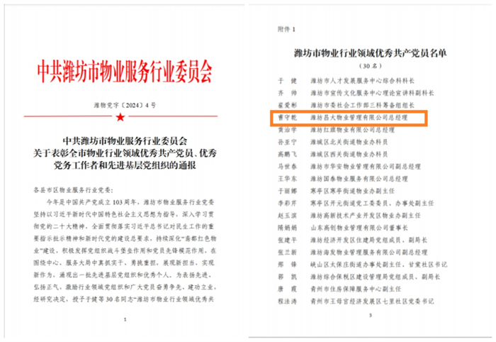 2024年7月1日,濰坊市物業(yè)服務(wù)行業(yè)黨委發(fā)文:濰物黨字〔2024〕4號(hào)《關(guān)于表彰全市物業(yè)行業(yè)領(lǐng)域優(yōu)秀共產(chǎn)黨員、優(yōu)秀黨務(wù)工作者和先進(jìn)基層黨組織的通報(bào)》,濰坊昌大物業(yè)有限公司總經(jīng)理曹守乾被授予“濰坊市物業(yè)行業(yè)領(lǐng)域優(yōu)秀共產(chǎn)黨員”稱(chēng)號(hào)。