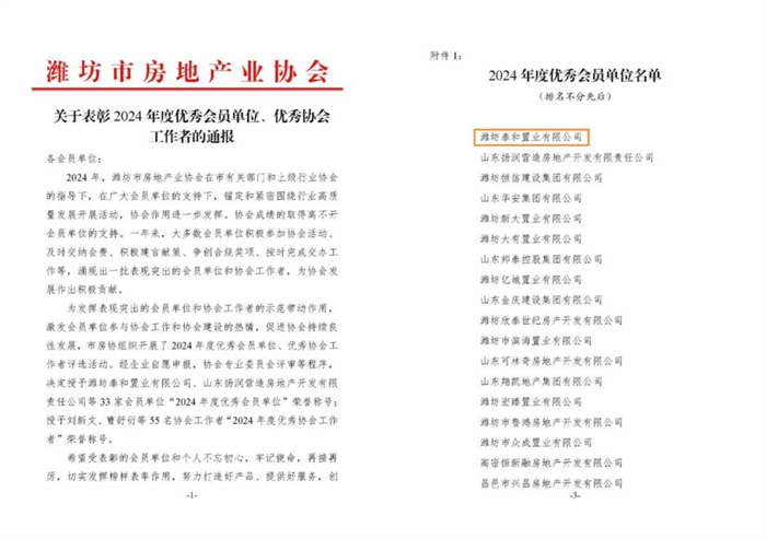 濰坊市房地產(chǎn)業(yè)協(xié)會:授予泰和置業(yè)“2024年度優(yōu)秀會員單位”
