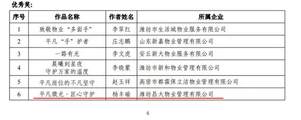2025年5月30日,在全市物業(yè)行業(yè)“關愛一線物業(yè)人 致敬最美勞動者”攝影及微視頻展活動中,濰坊昌大物業(yè)管理有限公司提報的兩部作品雙雙獲獎!《肩上的春天》榮獲三等獎,《平凡微光·匠心守護》榮獲優(yōu)秀獎,這份雙重榮譽,是對昌大物業(yè)企業(yè)文化的生動詮釋,更是對全體物業(yè)人敬業(yè)精神的崇高禮贊!
