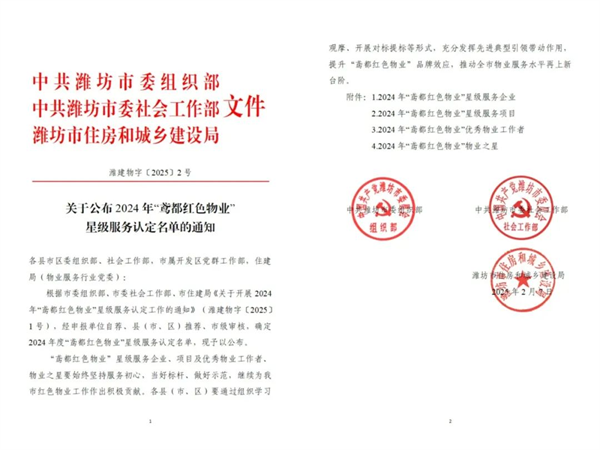 2月7日,各縣市區(qū)委組織部、社會工作部,市屬開發(fā)區(qū)黨群工作部,住建局(物業(yè)服務行業(yè)黨委),根據市委組織部、市委社會工作部、市住建局《關于開展2024年“鳶都紅色物業(yè)"星級服務認定工作的通知》(濰建物字【2025】1號)公布2024年度“鳶都紅色物業(yè)”星級服務認定名單。其中,昌大物業(yè)榮膺2024年度“鳶都紅色物業(yè)”星級服務企業(yè),旗下所轄項目泰和雅筑、泰和東郡雙雙入選為2024年“鳶都紅色物業(yè)”星級服務項目,項目經理王磊榮獲2024年“鳶都紅色物業(yè)”物業(yè)之星。