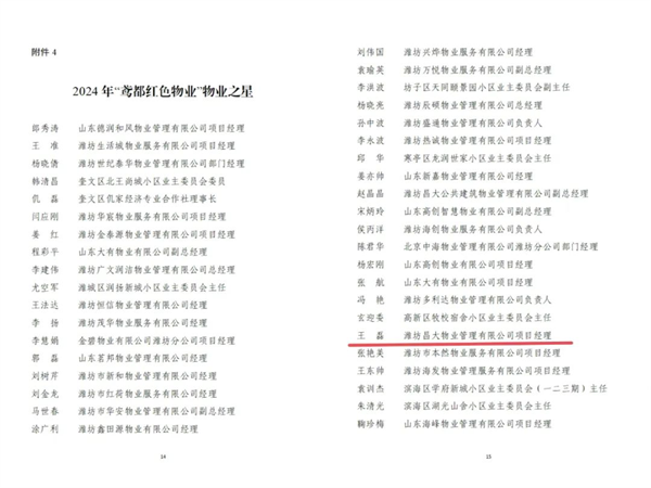 為表彰行業(yè)先進、樹立行業(yè)典型,充分發(fā)揮先進典型的示范引領作用,以點帶面提升全區(qū)物業(yè)服務水平,中共濰坊高新區(qū)物業(yè)服務行業(yè)委員會于2025年2月21日授予相關單位及個人榮譽。其中,昌大物業(yè)榮獲“2024年度高新區(qū)優(yōu)秀物業(yè)服務企業(yè)”,項目經理王紹艷獲評為“2024年度高新區(qū)優(yōu)秀物業(yè)項目經理”。