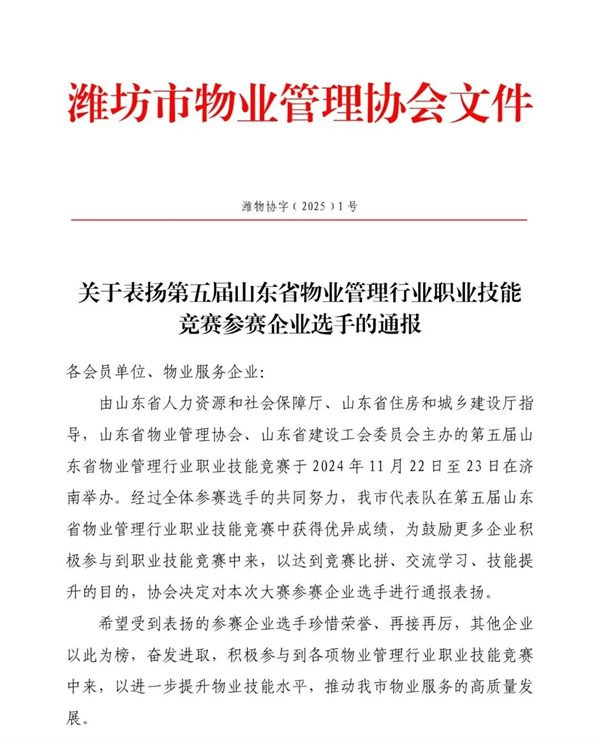 2025年1月2日,濰坊市物業(yè)管理協(xié)發(fā)布關于表揚第五屆山東省物業(yè)管理行業(yè)職業(yè)技能競賽參賽企業(yè)選手的通報,其中昌大物業(yè)管理員宮翠瓊在競賽中成績優(yōu)異獲得表揚通報。