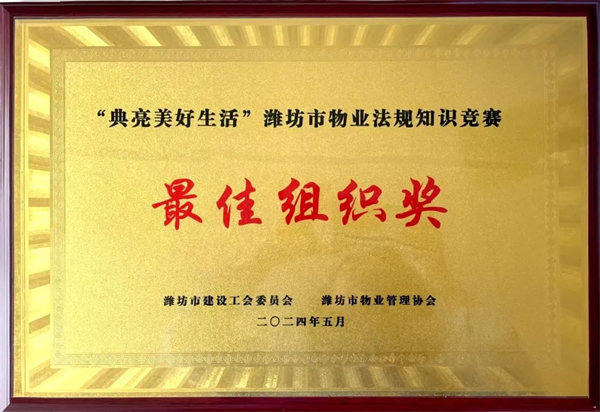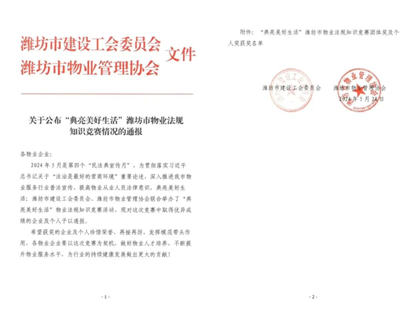2024年5月,濰坊市建設工會委員會、濰坊市物業(yè)管理協(xié)會聯(lián)合舉辦了“典亮美好生活”物業(yè)法規(guī)知識競賽活動,旨在深入推進我市物業(yè)服務行業(yè)普法宣傳,提高物業(yè)從業(yè)人員法律意識,典亮美好生活。獲獎名單包括團體獎、個人獎各10名,其中昌大物業(yè)榮獲最佳組織獎,物業(yè)管理員宮翠瓊、王燕分別榮獲個人獎。