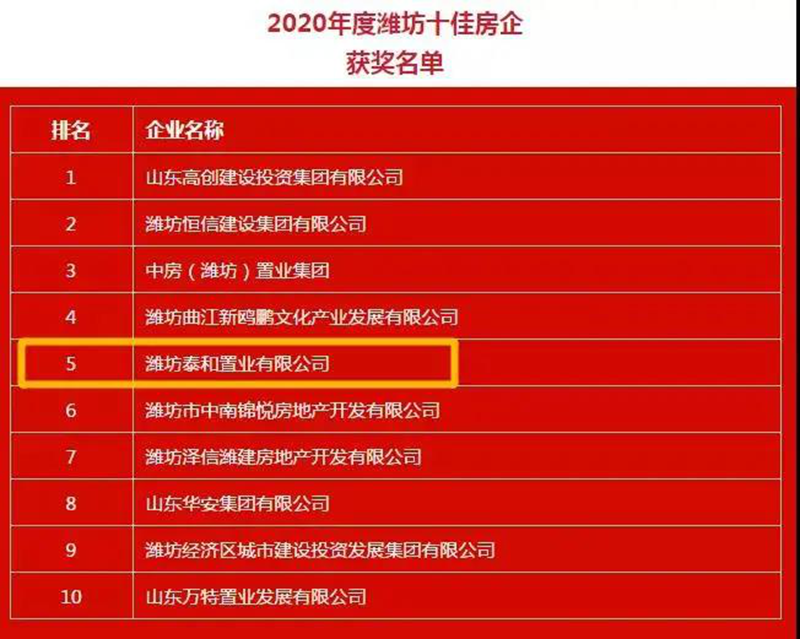 在由山東省互聯(lián)網(wǎng)傳媒集團-大眾網(wǎng)濰坊發(fā)起的“聚實力,開新局”2020年濰坊地產(chǎn)行業(yè)評選活動中,泰和置業(yè)憑借超高的人氣和社會影響力,在全市房地產(chǎn)企業(yè)中,以排名前十的成績獲評“2020年度濰坊十佳房企”獎。