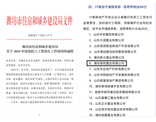 泰和置業(yè)榮獲濰坊市住建局2019年度農(nóng)民工工資清欠工作情況通報表彰
