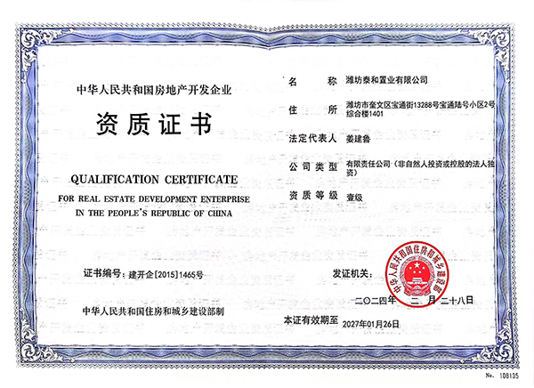 泰和公司成功延續(xù)房地產(chǎn)開發(fā)企業(yè)一級資質(zhì)