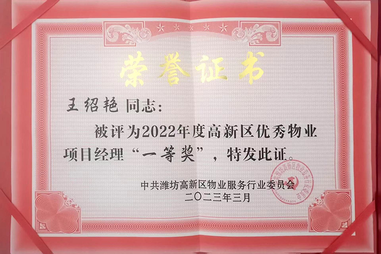 3. 泰和上筑項(xiàng)目經(jīng)理王紹艷獲“2022年度高新區(qū)優(yōu)秀物業(yè)項(xiàng)目經(jīng)理一等獎(jiǎng)”