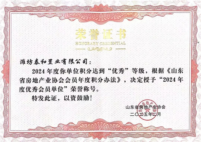 濰坊市房地產(chǎn)業(yè)協(xié)會:授予泰和置業(yè)“2024年度優(yōu)秀會員單位”