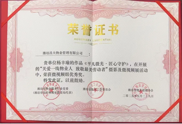 2025年5月30日,在全市物業(yè)行業(yè)“關愛一線物業(yè)人 致敬最美勞動者”攝影及微視頻展活動中,濰坊昌大物業(yè)管理有限公司提報的兩部作品雙雙獲獎!《肩上的春天》榮獲三等獎,《平凡微光·匠心守護》榮獲優(yōu)秀獎,這份雙重榮譽,是對昌大物業(yè)企業(yè)文化的生動詮釋,更是對全體物業(yè)人敬業(yè)精神的崇高禮贊!