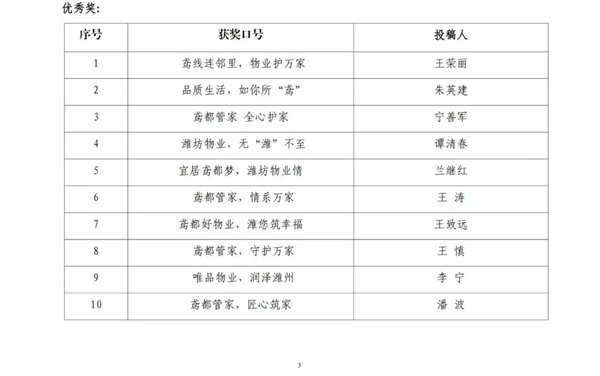 2025年7月11日,全市物業(yè)行業(yè)宣傳口號征集評選結果正式揭曉,昌大物業(yè)憑借“鳶都物業(yè)管家,貼心服務萬家”的響亮口號,從全國各地800余條投稿中脫穎而出,榮獲三等獎!這一口號充分展現了昌大物業(yè)扎根濰坊、服務萬家的責任擔當,同時展現了昌大物業(yè)“讓生活更美好”的堅定服務承諾。