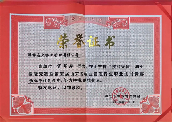 2025年1月2日,濰坊市物業(yè)管理協(xié)發(fā)布關于表揚第五屆山東省物業(yè)管理行業(yè)職業(yè)技能競賽參賽企業(yè)選手的通報,其中昌大物業(yè)管理員宮翠瓊在競賽中成績優(yōu)異獲得表揚通報。