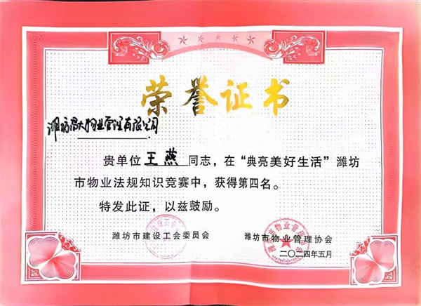 2024年5月,濰坊市建設工會委員會、濰坊市物業(yè)管理協(xié)會聯(lián)合舉辦了“典亮美好生活”物業(yè)法規(guī)知識競賽活動,旨在深入推進我市物業(yè)服務行業(yè)普法宣傳,提高物業(yè)從業(yè)人員法律意識,典亮美好生活。獲獎名單包括團體獎、個人獎各10名,其中昌大物業(yè)榮獲最佳組織獎,物業(yè)管理員宮翠瓊、王燕分別榮獲個人獎。